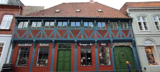Después de 30´ de carretera llegamos al parking de Ribe, desde el parking por un sendero en pocos minutos se llega al centro. Cruzamos un pequeño canal y luego por Puggaardsgade pasamos frente al Taarnborg, sitio histórico de la ciudad, Taarnborg de Ribe es una de las casas renacentistas mejor conservadas del país, la mansión del casco antiguo en ladrillo, se construyó entre 1570 y 1580 y es una de las pocas propiedades de la ciudad que quedan de ese período en Dinamarca. La casa es parte de la colección de propiedades históricas de Realdania By & Byg, que representan la cultura de la construcción danesa durante 500 años, muchas casas de entramado de madera, pintadas y muy cuidadas todas, sus calles y aceras de adoquines.